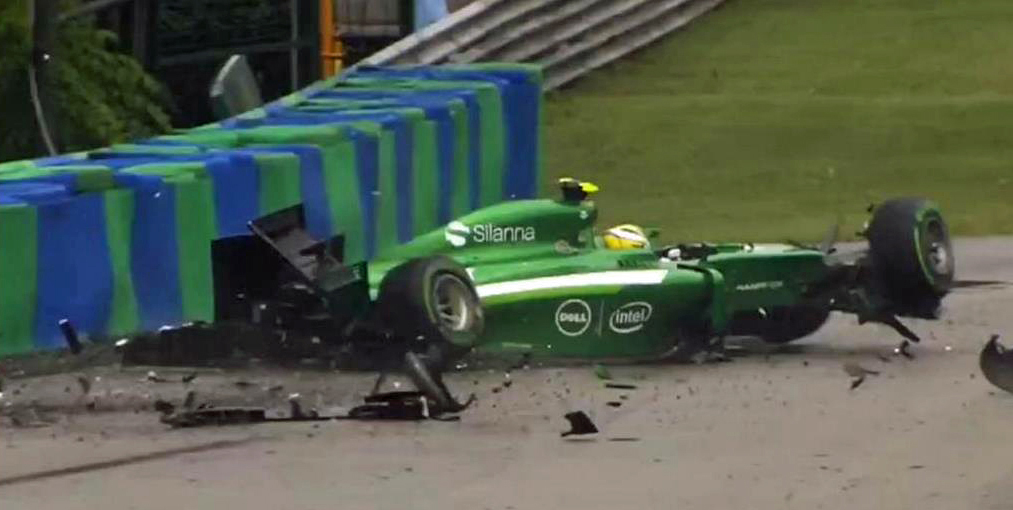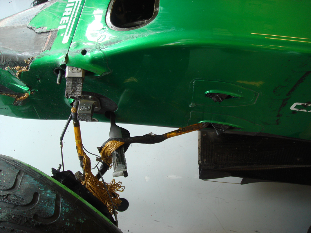 The car was then used at the German Grand Prix by Marcus and the following race in Hungary was its last. Marcus hit a damp patch on the outside of turn three in Hungary on lap 7 and then hit the wall. The crash was high impact and smashed the carbon wishbones off into the monocoque. Something that I had to have repaired later but the below image from James Moy shows the accident.