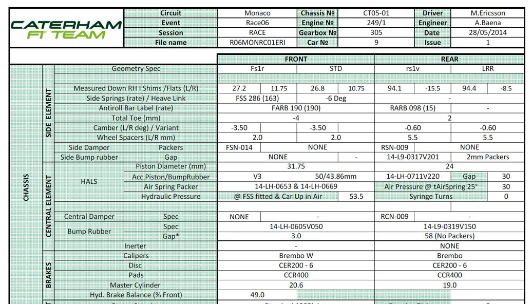 The car reached the teams highest position since Petrov scored an 11th place in Brazil 2012 by equalling that in Monaco and ending only 2.4 seconds off of a Championship point. Below is the set up used on Chassis#1