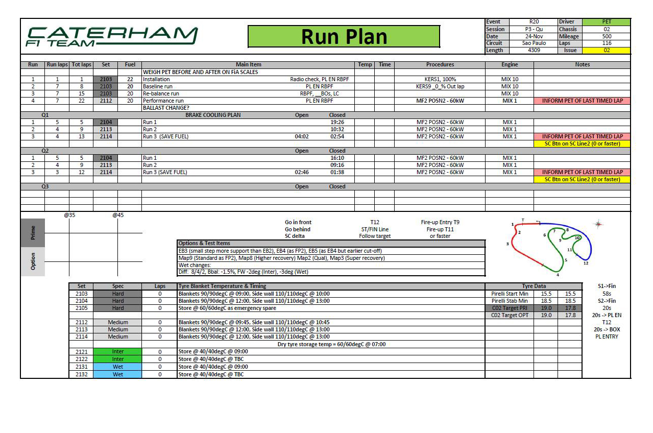 As the Brazil result was the best in the teams history, below is the run plan for Vitaly Petrov for race day.